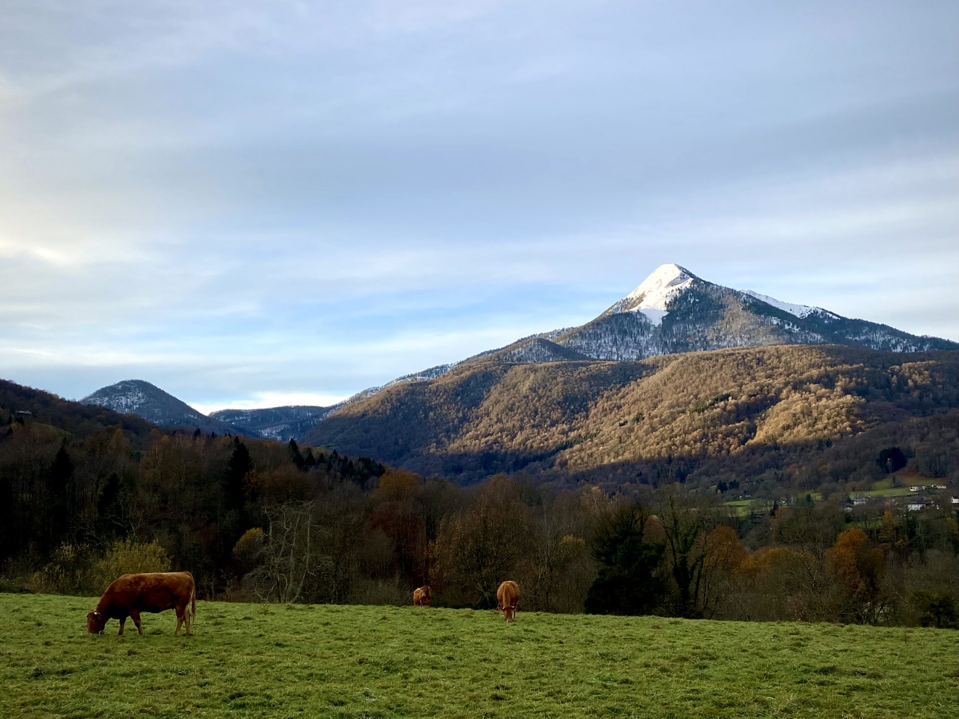 0,900 km – Au sommet de la côte prenez la large piste à droite, en face de la ferme, elle monte environ sur 500m. Avant d’arriver dans les prés, prenez le petit sentier à gauche. Ce sentier longe la crête et offre une magnifique vue sur le pic de Cagire, et la station du Mourtis.Vous avez rejoint une piste qui, au bout de quelques centaines de mètres, se transforme en route goudronnée : continuez tout droit.